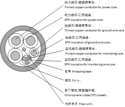 flame resistance, sun aging, wear resistance, tear resistance, salt spray resistance, cyclic bending (meet IEC80005.1 provisions of 5000 winding test) and excellent electrical performance (pressure test 3.5kV /5min). |